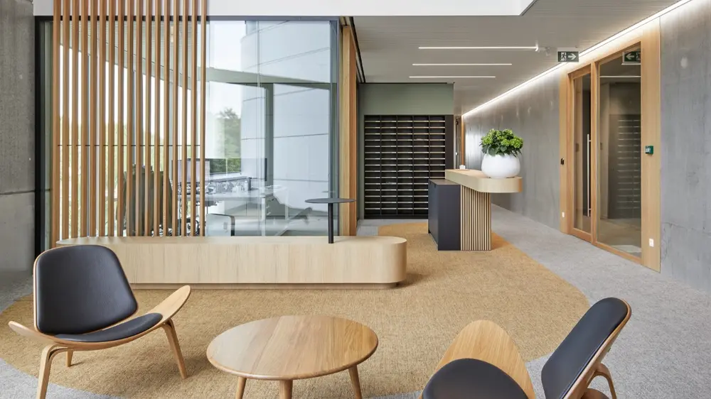 Een stijlvolle mix van hout, gietvloeren, aluminium en akoestische oplossingen bepaalt de sfeer in het nieuwe Lybover-kantoor in Waregem. De Laere Decor creëerde een warme, hedendaagse werkomgeving die comfort en klasse uitstraalt.