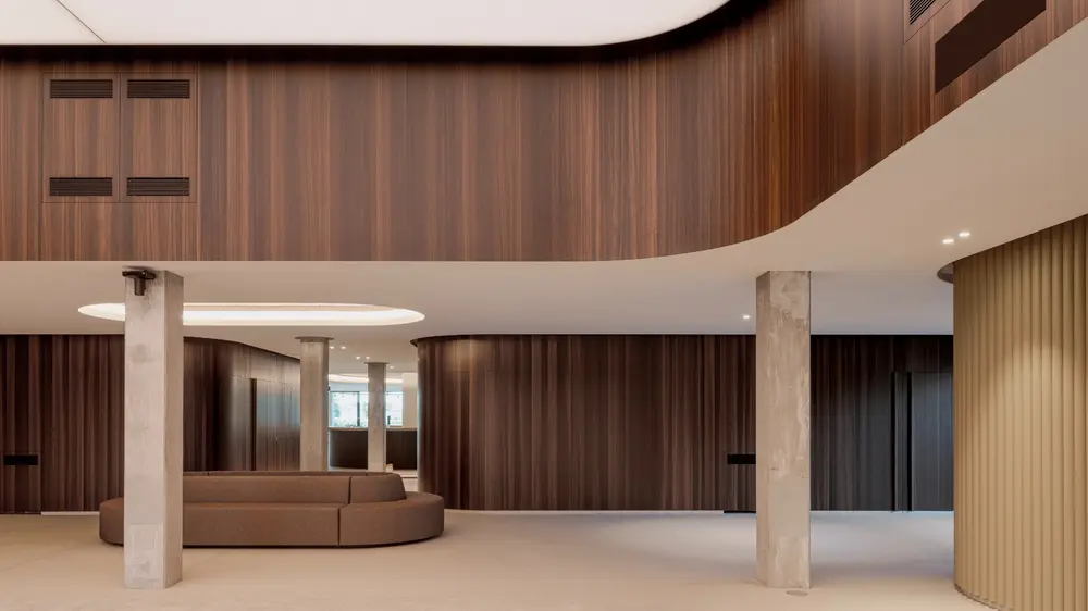 De inkomhal van de Ruiterhal in Brasschaat straalt verfijning en vakmanschap uit dankzij het maatwerk van Pro Interieur. Verticale latten in rubberwood vormen een ritmisch patroon dat de ruimte warmte en dynamiek geeft.
