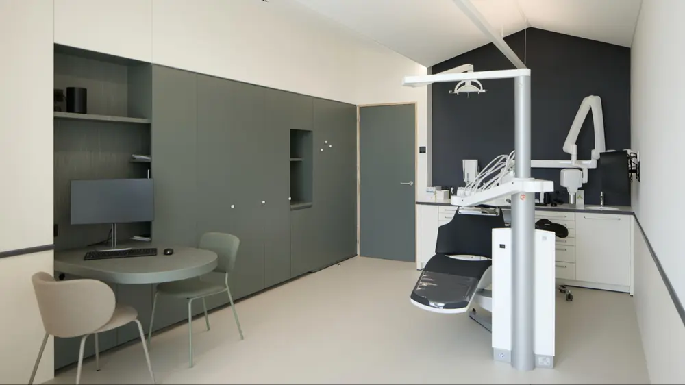 De Laere Decor realiseerde in Bellegem een tandartspraktijk die tot in het kleinste detail klopt. Elk element - van gipswand en brandwerende deuren tot 15 tandartsenkabinetten - werd in eigen beheer geproduceerd en geplaatst.
