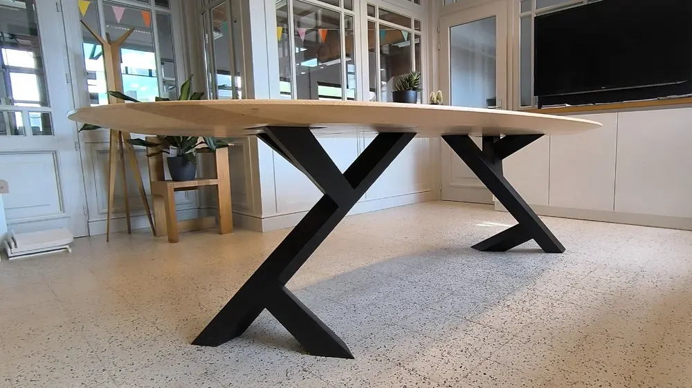 Voor dit eindwerk ontwierp en realiseerde een leerling van het 6de jaar Houttechnieken een volledig houten tafel met ovale vorm en kruispoot, vervaardigd volgens strikte ontwerp- en uitvoeringscriteria.