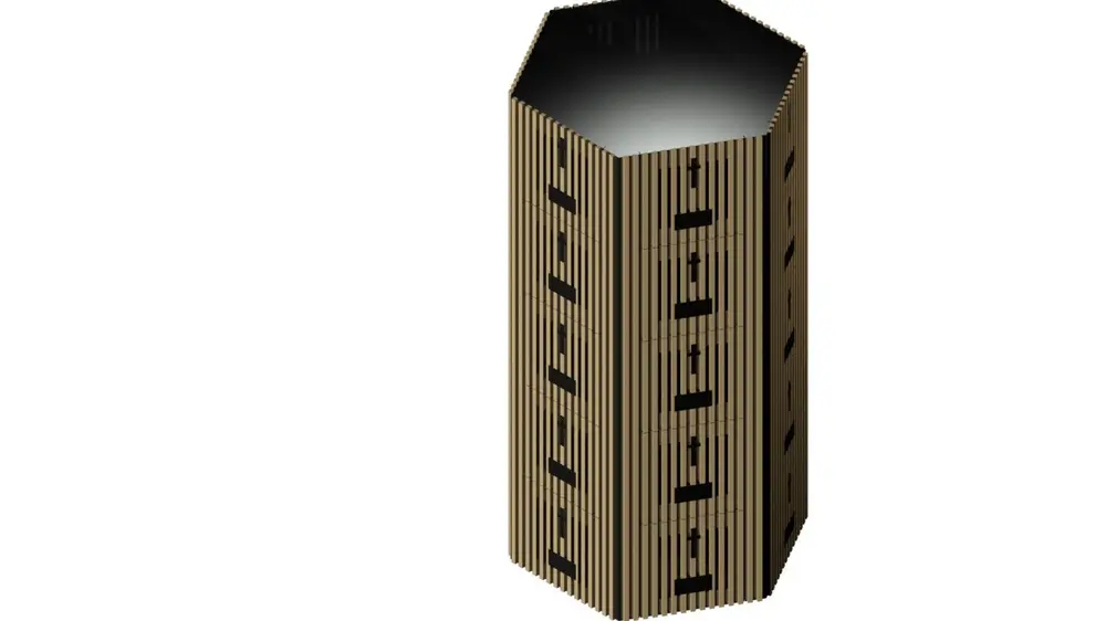 Dit moderne wijnrek uit zwart MDF met eucalyptushoutfineer werd volledig ontworpen en vervaardigd door één leerling van Don Bosco Onderwijscentrum vzw. Het meubel onderscheidt zich door ...