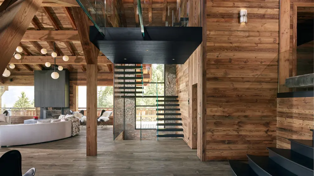 In een luxueuze chalet in de Franse Alpen realiseerde genico creative stairs een uitzonderlijke designtrap van vier verdiepingen met een zes meter lange glazen loopbrug. Het project vroeg het uiterste op vlak van precisie, materiaalbeheersing en logi