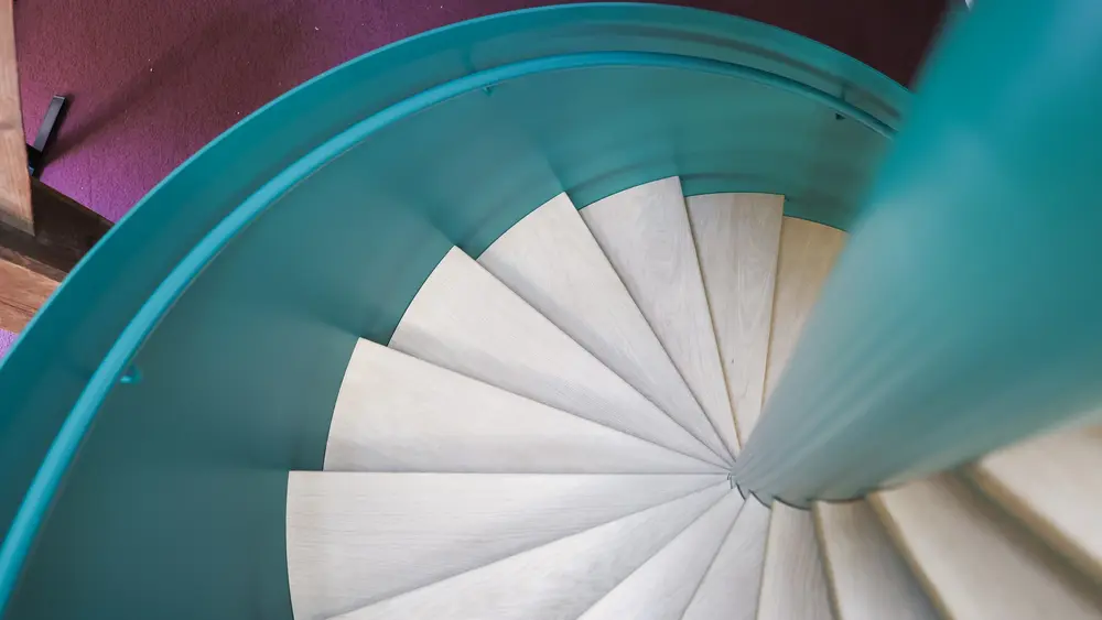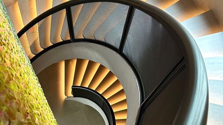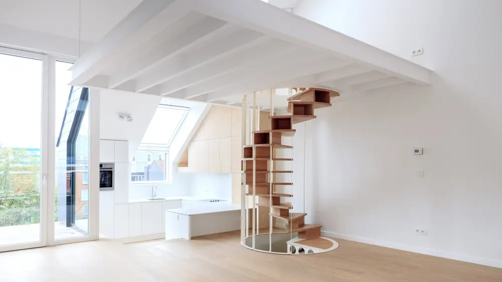 In een minimalistische loft in Leuven creëerde JO-A twee naadloos opeenvolgende wenteltrappen die de hoofdverdiepingen en mezzanine verbinden. De trappen vormen samen een architecturale sculptuur die het interieur structureert en lichtheid toevoegt.